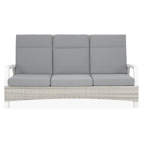Canapea exterior, 3 locuri Baku. Canapeaua Baku este alegerea ideala pentru ca voi sa va bucurati de momente de relaxare in compania celor dragi. Canapeaua Baku este realizata din structura de aluminiu vopsita in camp electrostatic pentru o rezistenta si durabilitate de lunga durata. Latura estetica este oferita de impletitura cu fibre sintetice ce imita ratanul, rezistente la razele UV. Confortul deplin si comoditatea sunt redate de pernele incluse, confectionate din tesatura Olefin, rezistente la umezeala si decolorare, accesorizate cu fermoar pentru o curatare si indepartare usoara. Spatarul scaunelor se poate regla in functie de preferintele voastre gratie pompei de gaz inclusa. Citeste mai multe despre intretinere.