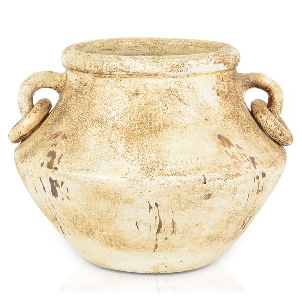 Informatii generale Articol Vaza cu manere Dimensiuni O.35 x H.25 cm Forma Cilindru Material Teracota Culoare Bej Greutate 4.69 kg Utilizare Interior Rezistenta la apa Nu