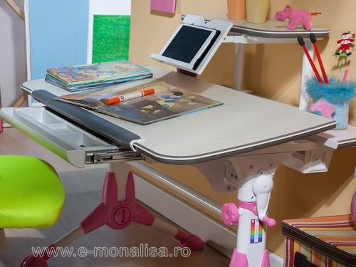 ACEST PRODUS NU MAI FACE PARTE DIN OFERTA NOASTRA Va rugam consultati categoria Mobilier Birou pt. mai multe modele Birouri Copii de Scoala cu Inaltime Reglabila si Blat Reglabil - Step Roz Un birou modern ce ofera toate facilitatile pentru pentru o pozitie corecta de studiu atat pentru prescolari dar si pentru scolari. In varianta alb roz biroul este destinat fetitelor din clasele pregatitoare dar si fetelor ce pasesc pragul scolilor. Reglajele disponibile atat pentru inaltimea blatului de lucru dar si pentru inclinatie asigura reglajul optim unei pozitii corecte a coloanei vertebrale dar si a intregului corp. Pozitia si inclinatia recomandata pentru scris poate fi reglata cu finete iar utilitatea nu se opreste aici. Biroul este prevazut si cu un suport pentru carte sau tableta dar si cu un sertar multifunctional cu organizator ce poate adaposti cu usurinta si in ordine toate pixurile, stilourile, gumele sau creioanele necesare elevului ce se pregateste de scoala. Pentru cei ce inca mai folosesc calculator biroul ofera o polita ce poate sustine monitorul optimizand astfel spatiul pe suprafata de lucru. Step este un birou ergonomic practic si de calitate pentru copii care sunt inca in crestere si nu numai. Inaltimea reglabila ofera o pozitie corecta de studiu pentru orice varsta iar prin functia de blat reglabil se poate stabili inclinatia - unghiul blatului de lucru. Inclinatia suprafetei de studiu este foarte importanta. Daca inaltimea biroului poate fi compensata uneori prin reglarea inaltimii scaunului inclinarea suprafetei de lucru nu poate fi compensata in nici un fel. Birourile pentru copii de scoala Step nu sunt doar ergonomice, ele ofera si un ambient de exceptie in camera copiilor. Biroul Step este disponibil in doua variante de culori: alb - roz pentru fete si birou reglabil alb - albastru pentru baieti. Birourile pentru scolari si prescolari Step sunt disponibile online sau in magazin cu livrare atat in Bucuresti dar si in toata tara la cele mai mici preturi Scaunul si obiectele din decor nu fac obiectul vanzarii