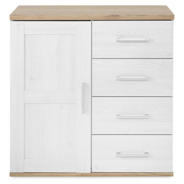 Informatii generale Articol Comoda Dimensiuni L. 93 x l. 45 x H. 100 cm Material PAL Culoare Alb, stejar natur, finisaj mat Numar compartimente 1 Manere Aplicate, material plastic Picioare 4 buc., H.2 cm Material picioare Plastic Culoare picioare Gri, finisaj mat Top Dimensiuni L. 93 x l. 45 x H. 3,2 cm Material top PAL Culoare top Stejar natur, finisaj mat Compartiment 1 Dimensiune compartiment L. 93 cm Numar usi 1 buc. PAL, tip batant Culoare usa Alb, finisaj mat Numar sertare 4 buc., L. 46 x l. 23 cm Suprafata utila sertar L. 39 x l. 33 cm Material sertar PAL, culoare alb, finisaj mat