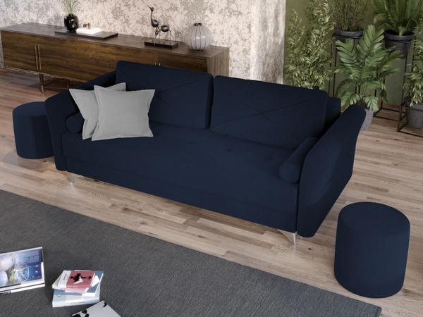 Canapea Bali Albastra Canapea Bali Albastra are un design modern, contemporan, cu un aspect aparte dat de pernele tip rulou si bratele rotunjite. Picioarele argintii lucioase completeaza eleganta acestei canapele. Pe langa aspect, ofera confort prin cele 4 perne detasabile cat si prin faptul ca se poate transforma rapid intr-un pat ce are lada de depozitare dedesubt. Bratele, sezutul si pernele de la spatar au cusaturi ce dau un design armonios in orice camera. Este recomandata atat pentru incaperi mici sau mari si are dimensiunea de: 230 cm lungime, 100 cm latime, 90 cm inaltime totala . Dupa extindere, obtineti un spatiu pentru odihna si relaxare, cu suprafata utila 193 x 145 cm . Este tapitata cu o stofa de calitate uni pe diverse culori. Atentie: Pretul afisat nu include alte accesorii sau obiecte de decor. Taburetele, pernele deco si draperiile se pot achizitiona optional. Livrare gratuita si rapida, 4-10 zile lucratoare prin flota proprie Suntem producatori de tapiterii, fara intermediari Toate piesele de tapiterii au o garantie de 2 ani Sezutul si extensia canapelei sunt pe relaxa (arcuri elicoidale si poliuretan) . Lada incorporata este ideala pentru depozitarea lenjeriei sau a altor obiecte. Scheletul este rezistent, realizat pe structura solida de fag si pal. Extensia este de tip Doppelliege ce prezinta un sistem actionat prin role, astfel ca partea de sezut se trage si permite partii de spatar sa gliseze spre partea din fata si sa se pozitioneze orizontal. Canapea Bali Albastra se incadreaza cu usurinta in majoritatea locuintelor indiferent de stilul acestora. Puteti alege din mai multe culori pentru stofa. Produsele disponibile le puteti vedea aici Modele Bali .