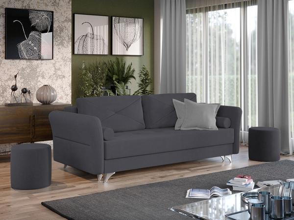 Canapea Bali Gri Canapea Bali Gri are un design modern, contemporan, cu un aspect aparte dat de pernele tip rulou si bratele rotunjite. Picioarele argintii lucioase completeaza eleganta acestei canapele. Pe langa aspect, ofera confort prin cele 4 perne detasabile cat si prin faptul ca se poate transforma rapid intr-un pat ce are lada de depozitare dedesubt. Bratele, sezutul si pernele de la spatar au cusaturi ce dau un design armonios in orice camera. Este recomandata atat pentru incaperi mici sau mari si are dimensiunea de: 230 cm lungime, 100 cm latime, 90 cm inaltime totala . Dupa extindere, obtineti un spatiu pentru odihna si relaxare, cu suprafata utila 193 x 145 cm . Este tapitata cu o stofa de calitate uni pe diverse culori. Atentie: Pretul afisat nu include alte accesorii sau obiecte de decor. Taburetele, pernele deco si draperiile se pot achizitiona optional. Livrare gratuita si rapida, 4-10 zile lucratoare prin flota proprie Suntem producatori de tapiterii, fara intermediari Toate piesele de tapiterii au o garantie de 2 ani Sezutul si extensia canapelei sunt pe relaxa (arcuri elicoidale si poliuretan) . Lada incorporata este ideala pentru depozitarea lenjeriei sau a altor obiecte. Scheletul este rezistent, realizat pe structura solida de fag si pal. Extensia este de tip Doppelliege ce prezinta un sistem actionat prin role, astfel ca partea de sezut se trage si permite partii de spatar sa gliseze spre partea din fata si sa se pozitioneze orizontal. Canapea Bali Gri se incadreaza cu usurinta in majoritatea locuintelor indiferent de stilul acestora. Puteti alege din mai multe culori pentru stofa. Produsele disponibile le puteti vedea aici Modele Bali .