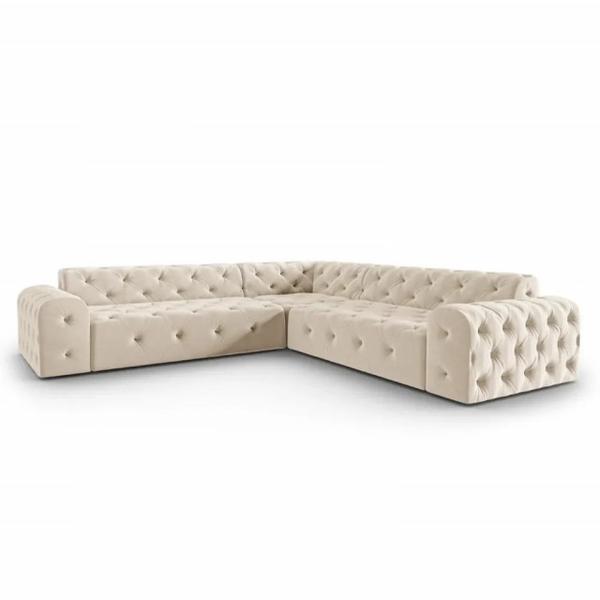 Descriere Canapea bej din catifea si lemn de pin pentru 5 persoane Candice Besolux Dimensiuni: \- Lungime: 254 cm \- Latime: 254 cm \- Inaltime: 80 cm \- Inaltime sezut: 40 cm \- Dimensiuni sezut: 63x...