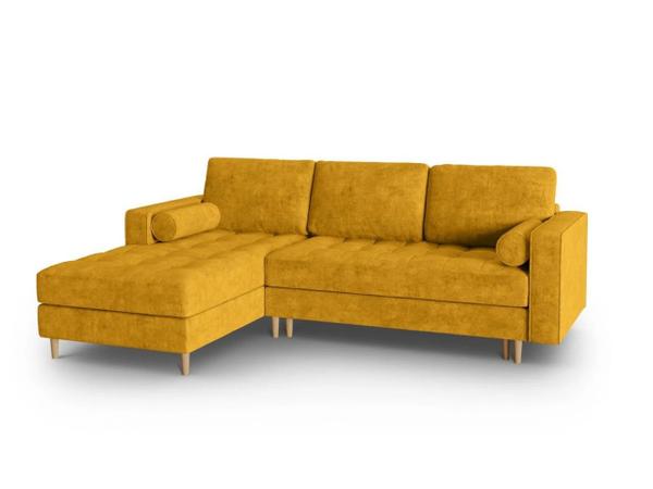 Descriere Canapea cu colt extensibila galben din textil si lemn 5 persoane Gobi Besolux Dimensiuni: \- Inaltime sezut: 49 cm \- Dimensiuni sezut: 75x80 cm \- Dimensiuni canapea extinsa: 140x210 cm Sar...