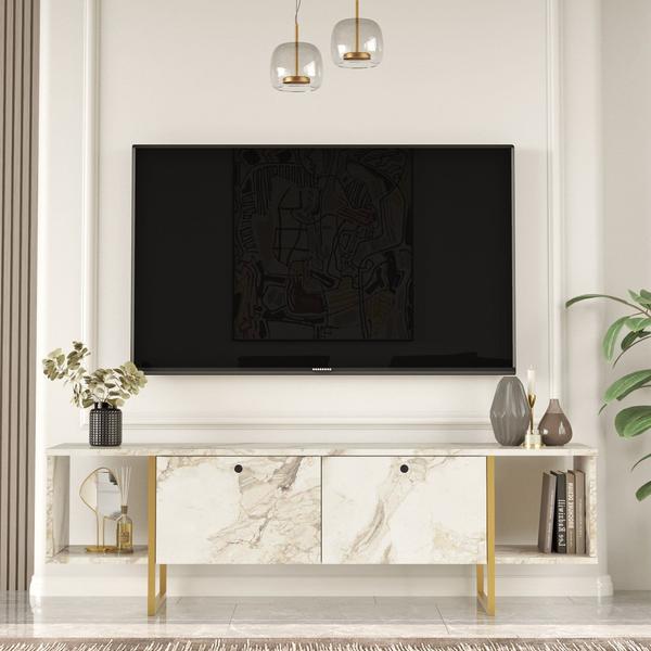 INFORMATII PRODUS Categorie Comode Tip comoda TV Material PAL melaminat, metal Culoare crem cu efect de marmura, auriu Lungime 160 cm Adancime 40 cm Inaltime 48 cm Sistem clasic Picioare da Tip (usi,...