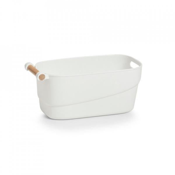 Descriere Cutie alba/maro din fibre sintetice si lemn Tia Zeller Material: polipropilena si lemn de arbore de cauciuc Depozitati obiecte mici in bucatarie, baie sau birou cu aceasta cutie de depozitare cu design modern. Pe langa un maner integrat, cutia are o bara cu ax de cauciuc de 10 cm lungime.