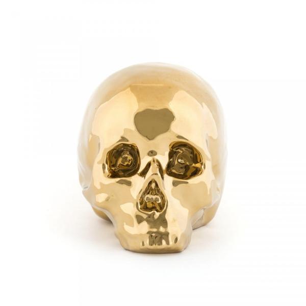 Descriere Decoratiune aurie din portelan 15 cm My Skull Seletti Dimensiuni: \- Lungime: 25 cm \- Latime: 14 cm \- Inaltime: 15 cm Material: portelan Se joaca pe arhetipul unor figuri care, in simplitatea lor, devin obiecte decorative pentru cele mai pop case. Un craniu punk, barci de hartie, roboti si rachete interstelare ne readuc in copilarie!