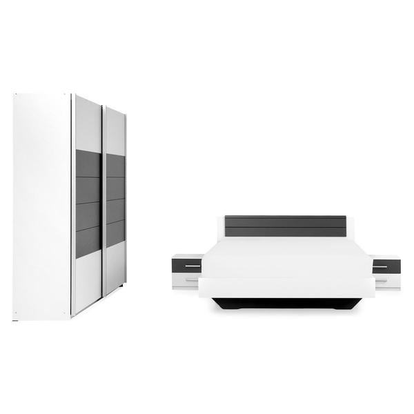Set mobilier dormitor, pat 160x200cm, dulap 2 usi culisante si 2 noptiere Dover. Amenajati-va dormitorul de acasa cu un set de mobilier format dintr-un pat, un dulap cu 2 usi culisante si 2 noptiere Dover pentru a schimba fata incaperii in care va petreceti timpul. Intregul set este realizat din materiale lemnoase de calitate, cromatica fiind una prietenoasa care va ofera un spatiu luminos. Dulapul are 2 polite si 2 bare pentru umerase unde puteti sa va stocati hainele, in timp ce noptiera vine cu 2 sertare pentru lucrurile de mici dimensiuni. Patul este unul confortabil pe care puteti sa aveti nopti odihnitoare acasa. Setul contine: \- dulap 2 usi culisante: L. 227 x l. 62 x H. 210 cm. - pat 160 x 200 cm: L. 206 x l. 166 x H. 85 cm. - 2 noptiere: L. 50 x l. 37 x H. 38 cm. Material: panouri aglomerate din lemn. Culoare: alb, lava grey. Citeste mai multe despre intretinere.
