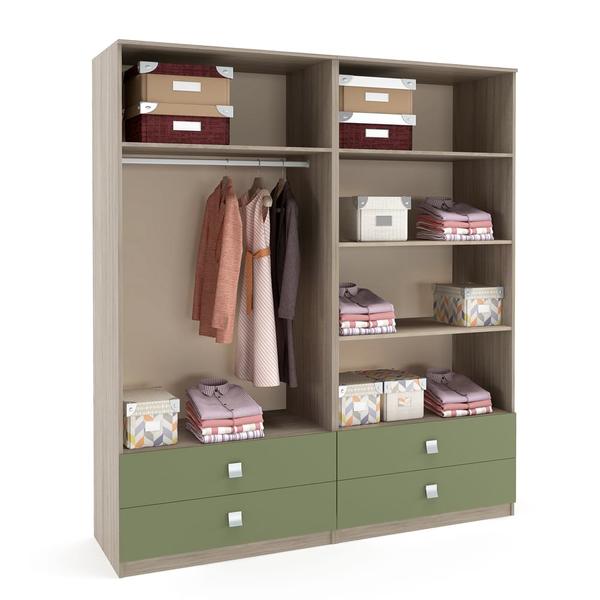 Dressing haine cu 4 usi si 4 sertare, mixt, compus din doua dulapuri independente care se pot monta si separat. Dulap LINEA 2U2S polite Dulap LINEA 2U2S bara umerase,polite Compartimentarea este completa, ofera spatii de depozitate pentru principale tipuri de depozitare: depozitare sertar depozitare polite depozitare umerase Acest ansamblu de dulapuri formeaza un dressing foarte util, cu avantaje considerabile din gestionarea hainelor. Lungime - 180cm ( 90cm + 90cm) Adancime - 52cm Inaltime - 200cm Mobilier kit - se livreaza demontat, ambalat in cutii de carton Kitul contine schita montaj, feronerie, certificat garantie si conformitate Materiale PAL dublu melaminat 16mm - Oak - carcasa PAL dublu melaminat 16mm - Oak, Pesto - fronturi Cant ABS 0,4mm Feronerie Italia Garantie producator 24 luni Livrare Gratuita in toata tara *Accesoriile din imagine nu sunt incluse in pret.
