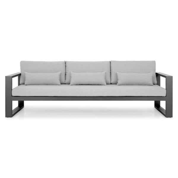 Informatii generale Articol Canapea exterior 3 Dimensiuni L.254 x l.88 x H.63 cm Numar locuri 3 Protectie UV Da Sezut Dimensiuni spatiu util L.240 x l.60 x H.47 cm Material perna Poliester Brate Brate incluse Da, 2 buc. Tip brat fix Baza Numar picioare 2 buc. H.26 cm Material Aluminiu Culoare Negru Spatar Dimensiuni L.240 x H.40 cm Numar perne spatar 3 Material perna spatar Poliester