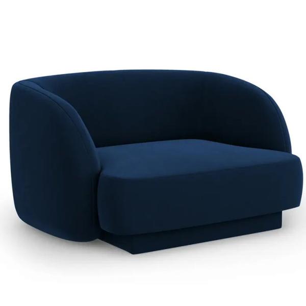 Descriere Fotoliu albastru royal din catifea si lemn de pin Miley Besolux Dimensiuni: \- Lungime: 109 cm \- Latime: 85 cm \- Inaltime: 74 cm \- Inaltime sezut: 42 cm \- Dimensiuni sezut: 60x75 cm \- Sarcina maxima: 150 kg Material: catifea, lemn masiv de pin, pal, placaj, metal si umplutura din silicon si spuma poliuretanica cu densitatea 30 kg/mc Piesele de mobilier moderne Miley impresioneaza prin formele lor rotunjite, care sunt perfect in acord cu cele mai recente tendinte de design interior. Pe langa forma lor unica, minimalista, acestea se caracterizeaza printr-un confort extraordinar. Spatarul jos si invaluitor trece usor in cotiere profilate, creand un aspect foarte consistent si natural.