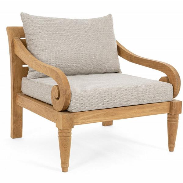 Descriere Fotoliu exterior bej/maro din lemn Karuba Bizzotto Material: lemn de tec reciclat, textil si polipropilena Pernele sunt incluse. Produsul este realizat din materiale naturale, astfel ca pot...