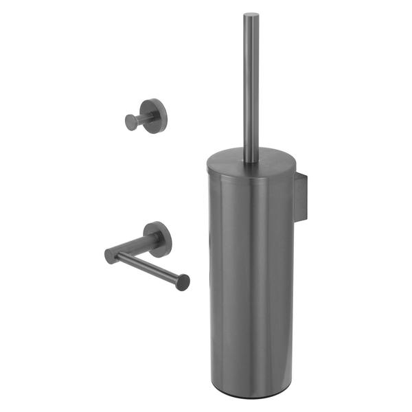 Set accesorii baie Koros. Realizat din inox si alama. Setul contine: - Perie WC: dia.8.9*H.25 cm - Suport hartie: 14.6*8*4.5 cm - Cuier prosop: 4.2*4*4.2 cm Culoare: alegeti culoarea dorita din campul de mai sus.