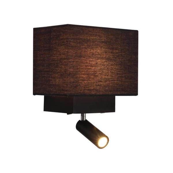 Lampa de perete cu abajur din material textil (E27 – nu este inclus) si spot de lectura LED flexibil. Prevazuta cu 2 intrerupatoare practice separate, amplasate direct pe corpul lampii. Aspect de culoare neagra. Sursa LED economica incorporata.
