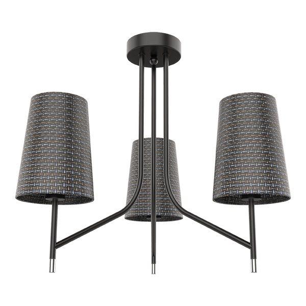 Plafoniera cu prindere de tavan si brate din metal vopsit cu abajururi din material textil rigid. Dimensiuni: D:470/H:410 mm Bec recomandat: 3xE14 Becurile nu sunt incluse.
