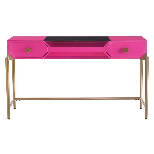 Birou Maddison. Biroul Maddison este o piesa accent, care contribuie la amenajarea unui spatiu functional si estetic. Acesta are un design unic, cu detalii prelucrate manual, conferind un plus de stil si autenticitate. Biroul are o structura metalica aurie si un blat din MDF in finisaj roz, completat de o polita din sticla. Biroul este prevazut cu doua sertare, cu manere geometrice aurii, oferind un spatiu amplu pentru depozitare. De asemenea, acesta poate indeplini si functia de consola. Dimensiuni: L.132 x l.46 x H.76 cm. Material: MDF, metal, sticla. Culoare: roz. Citeste mai multe despre intretinere.
