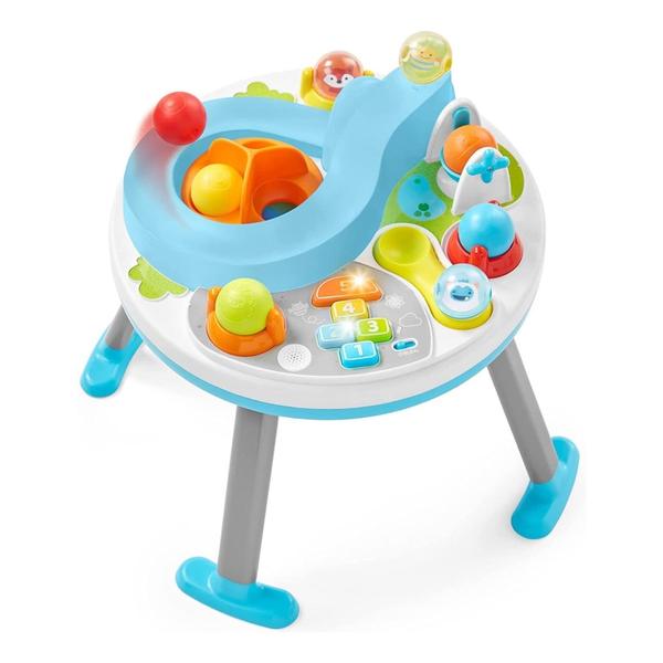 O masa de activitati moderna cu 20 de activitati care vor incanta copilul. Aspectul simplu si multiplele utilizari ale mesei vor face din aceasta un companion popular. Masa face posibila distractia pe 2 niveluri in functie de varsta copilului: primul pe podea si al doilea in picioare. Datorita unui numar mare de activitati, masa se adapteaza la dezvoltarea copilului. Copilului ii va placea cu siguranta sa prinda, sa arunce si sa rostogoleasca cele opt mingi colorate cu aspect voios sau sa se joace cu caruselul, toboganul sau alte activitati care incurajeaza distractia si creativitatea. Pian luminos cu 3 moduri: note muzicale, cantece si sunete, efect de lumina si functie de numarare. Picioare stabile pentru jocul cu masa atunci cand cel mic sta in picioare. Produsul trebuie asamblat de catre un adult. Necesita 3 baterii AA (nu sunt incluse). Capacitatea maxima portanta a mesei este de 18 kg. Pentru curatare, a se utiliza o laveta usor umeda si a se usca la aer sau a se usca prin sterge – produsul nu trebuie scufundat in apa. Masa este potrivita pentru copii incepand cu varsta de 6 luni si va creste odata cu cel mic pana la varsta de 3 ani.