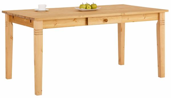 Descriere Masa Fasa cu sertar natur 160/90/75 cm Dimensiuni: 160/90/75 cm Material: lemn masiv de pin Culoare: natur extensia de dimensiune 45 cm x 2,4 cm x 90 cm se comanda separat si are codul 460376; se pot atasa extensii pe amandoua capetele mesei