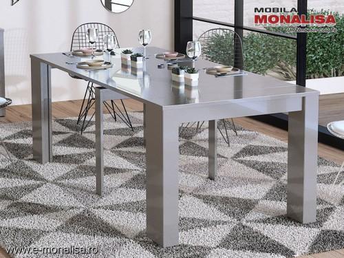 Masa extensibila Peninsule Gri lucios tip consola – Oferta online VEZI MODEL NOU IN STOC MASA EXTENSIBILA TIP CONSOLA CANDY Din oferta de vanzari online mese extensibile moderne va recomandam masa de tip consola extensibila de culoare gri lucios ce uimeste prin raportul calitate pret foarte bun prin robustete dar mai ales prin organizarea exceptionala a spatiului in bucatarie sau living. Conform specialistilor culoarea gri este culoarea favorita a anului viitor si ocupa prima pozitie in top preferinte amenajare bucatarie sau living mobilier si design interior pe stil modern. Masa Peninsule de culoare gri si finisaj lucios este o masa extensibila versatila ce ne ofera solutia ideala indiferent ca servim masa in 2 sau in 4 ori primim oaspeti si in jurul mesei suntem 6-8 sau 10 prieteni. In conditie de forta majora masa extensibila Peninsule poate servi pana la 12 persoane. Gama de mese extensibile Peninsule ofera un concept nou de extensie tip consola in 5 trepte. Inaltimea mesei Peninsule este de 75 cm iar blatul mesei are o latime generoasa de 95 cm. Cadrul mesei are o lungime de doar 43 de cm si fara placi de extensie montate ocupa foarte putin spatiu, practic poate fi folosit pe post de birou mic masa pt. televizor ori masa de colt cu diverse functionalitati. Prin montarea placilor de extensie masa poate avea o lungime de 98 - 152 - 208 cm iar prin montarea tuturor placilor de extensie (4) masa Peninsule poate ajunge la lungimea maxima de 264 cm. Masa Peninsule de culoare gri este fabricata din materiale de foarte buna calitate, picioarele si cadrul mesei sunt produse din pal lugios de culoare gri lucios dar si blatul plus placile de extensie sunt produse din pal melaminat cu finisaj gri lucios de cea mai buna calitate cantuit cu cant abs rezistent la umiditate si multiple frecari. Mecanismul ingenios ce permite glisarea in cele 5 pozitii este unul foarte rezistent si este produs din aluminiu dur. Conceptul impreuna cu mecanismul de extensie calitatea foarte buna a materialelor si a executiei fac din masa extensibila de tip consola Peninsule o alegere potrivita, masa ofera stabilitate foarte buna chiar si in pozitia maxim extinsa. Oferta de pret vanzare online masa Peninsule extensibila poate inceta fara instiintare, preturile pot suferi modificari in functie de materia prima si stocuri in depozite Transport Gratuit in zona Bucuresti Livram masa extensibila Peninsule la cele mai mici preturi in Toata Romania