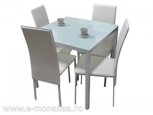 Masa de bucatarie din sticla Iceberg poate fi comandata cu blat din sticla neagra, alba, sau rosie. Masa Iceberg se acomodeaza perfect intr-un design modern atat pentru living cat si pentru bucatarie. Structura si picioarele sunt confectionate din metal si sunt vopsite in camp electrostatic. Masa cu blat din sticla Iceberg are o lungime de 80 cm, latime de 80 cm iar inaltimea este de 76 cm. Achizitionata impreuna cu un pachet de patru scaune beneficiati de un pret foarte avantajos.