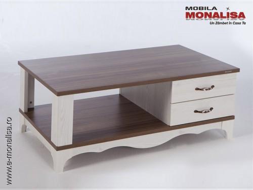 Masuta de cafea cu doua sertare – Venturo Daca sunteti in cautarea unei masute de cafea cu sertare eleganta si potrivita in amenajarea livingului sau sufrageriei dvs. cochete masuta de cafea cu 2 sertare Venturo este o alegere inteleapta. Calitatea este garantata de catre gigantul producator de mobila iar oferta de pret este foarte avantajoasa in gama de vanzari masute de cafea. Integritatea vizuala este asigurata de textura eleganta a molidului alb combinata cu blatul pe finisaj nuc inchis, combinatie ce formeaza un decor de exceptie. Identitatea masutei de cafea Venturo este punctata de manerele sertarelor decorate cu motive florale dar si de elementul de decor pozitionat pe spatele compartimentului celor doua sertare. Masuta de cafea cu 2 sertare Venturo prezinta dimensiuni generoase, blatul are o lungime de 110cm pe o latime de 60 cm iar inaltimea de 44cm este inaltimea optima pentru o masuta de cafea Importator direct mobila Bellona Cele mai mici preturi Garantat Transport Gratuit Bucuresti – ilfov si la cel mai mic pret in Toata Tara