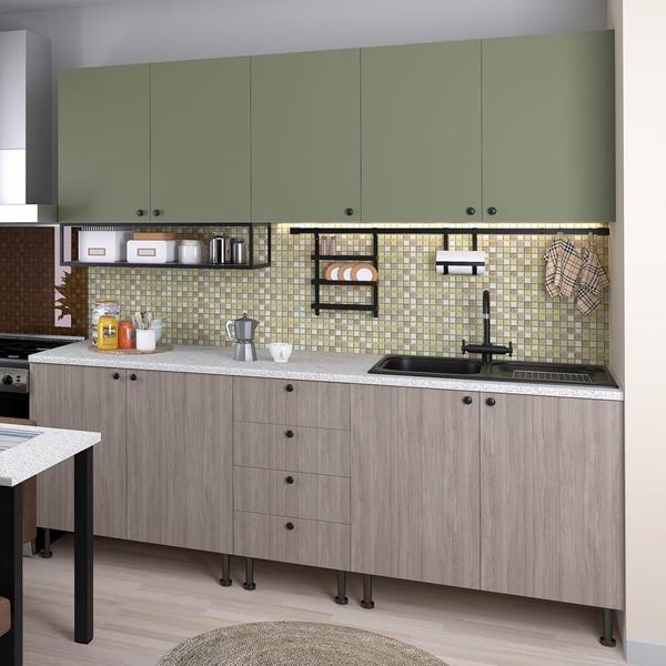 DOMINO - sistem modular de bucatarie Mobila de bucatarie DOMINO A225cm, cu carcasa din PAL Vizon, fronturi combinate din PAL Oak si PAL Pesto, blat termic este fabricata de TAMOS . Bucatarie configura...