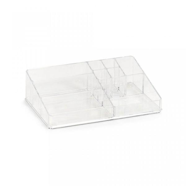 Descriere Organizator transparent din plastic Cosmetic Nine Big Zeller Dimensiuni: \- Lungime: 32 cm \- Latime: 21 cm \- Inaltime: 9 cm Material: plastic Organizatorul este prevazut cu 9 compartimente.