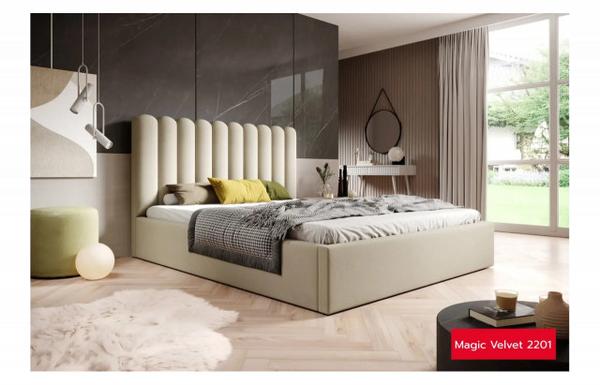 Descriere Pat bej din lemn si catifea 195x223 cm Jasmine FURPOL Material: lemn si catifea din poliester Salteaua nu este inclusa. Somiera este inclusa. Dimensiuni saltea: 180x200 cm Patul tapitat Jasm...