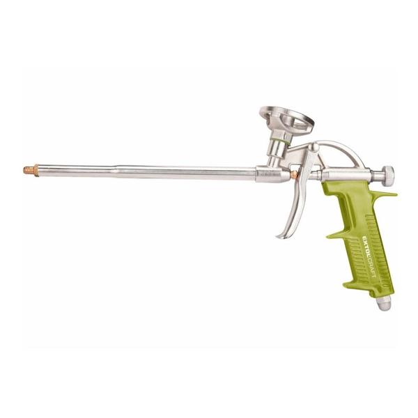 Pistol pentru spuma poliuretanica. Surub de reglare pentru ajustarea debitului de spuma. Aplicare precisa a spumei – risipa si mizerie minime. Cadru metalic. Aplicare usoara in locuri greu accesibile.