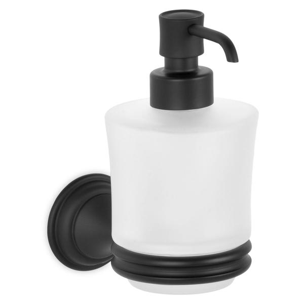 Suport sapun lichid Precious. Suportul de sapun lichid pentru baie Precious este caracterizat prin simplitate si eleganta, acesta fiind construit cu bun gust. Acesta este realizat din alama cromata si sticla sablata transparenta care ii confera acestuia rafinament. Suportul se poate monta in peretele baii. Dimensiuni: L. 8 x l. 14 x H. 16 cm. Material: alama, sticla sablata transparenta. Culoare: negru. Citeste mai multe despre intretinere.