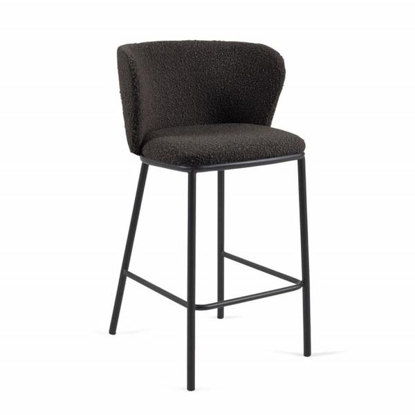 Descriere Scaun bar negru din material textil si metal Ciselia Shearling Kave Home Dimensiuni sezut: 39x45 cm Material: poliester, fibre acrilice ,otel, umplutura din spuma cu densitatea 28 kg/mc Sarc...