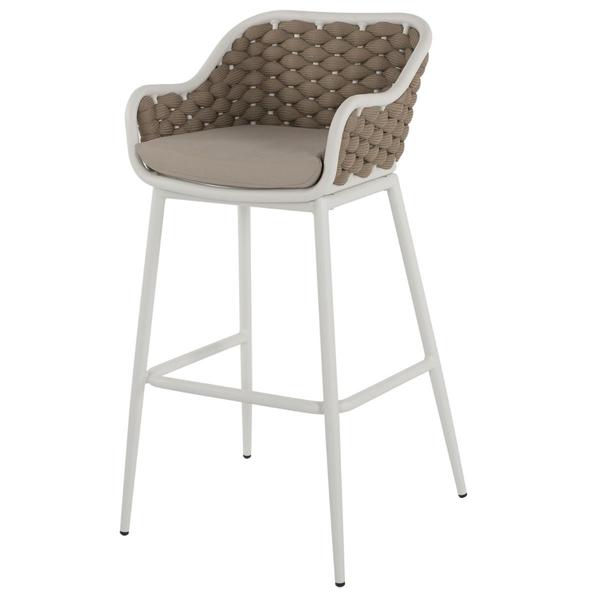Scaun de bar modern, realizat cu cadru din aluminiu vopsit cu pulbere si tapitat cu franghie sintetica groasa si durabila de inalta calitate (32x14mm). Dimensiune: 50 cm x 51 cm x 103 cm (W x D x H). Dimensiune sezut: 38 cm x 40 cm (W x D). Inaltime sezut: 82 cm. Inaltime brate: 92 cm.