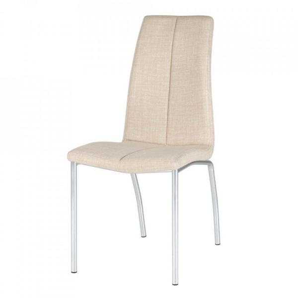 Descriere Scaun dining bej din textil si otel Carla Somcasa Dimensiuni: \- Lungime: 58 cm \- Latime: 44 cm \- Inaltime: 93 cm \- Inaltime sezut: 47 cm Material: \- Structura: otel cromat \- Tapiterie: textil \- Umplutura: spuma cu densitatea 30 kg/mc