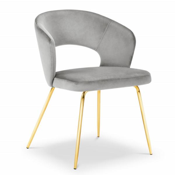 Descriere Scaun dining gri deschis/auriu din catifea si metal Wedi Besolux Dimensiuni: \- Lungime: 55 cm \- Latime: 56 cm \- Inaltime: 80 cm \- Inaltime sezut: 48 cm \- Dimensiuni sezut: 47x50 cm Mate...