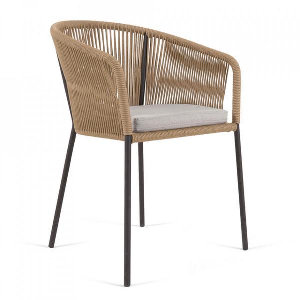 Descriere Scaun exterior dining bej din metal Yanet Kave Home Dimensiuni sezut: 41x42 cm Material: sfoara ,textil si otel, umplutura din spuma poliuretanica Sarcina maxima: 130 kg Pentru mesele in int...