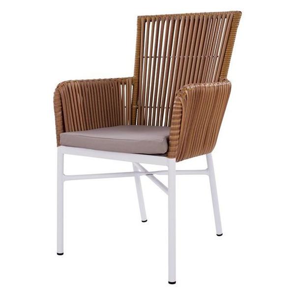 Scaun modern pentru spatii exterioare, construit din cadru din aluminiu de culoare alba si acoperit din rachita in culoare beige. Are si perna din pvc textline in culoare beige, grosime 5 cm. Impletitul are o durabilitate mare la temperaturi scazute si ridicate (-85C + 85C) cu stabilizator UV. Este perfect recomandat pentru uz profesional. Dimensiuni: 57x60x90 cm Inaltimea sezutului: 49 cm Inaltimea bratelor: 66,5 cm Grosimea pernei: 5 cm Dimensiuni sezut: 45x44 cm