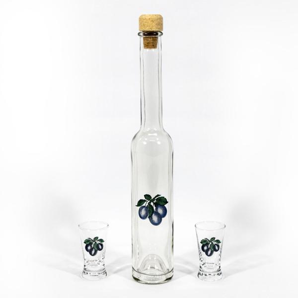 Set transparent potrivit pentru lichior de casa, cu un motiv de prune. Setul include 1 sticla cu dop de pluta, avand inaltime 31,5 cm si diametru 5 cm, si 2 pahare mici, avand inaltime 6,5 cm si diametru 3,5 cm. Volumul sticlei: 200 ml.