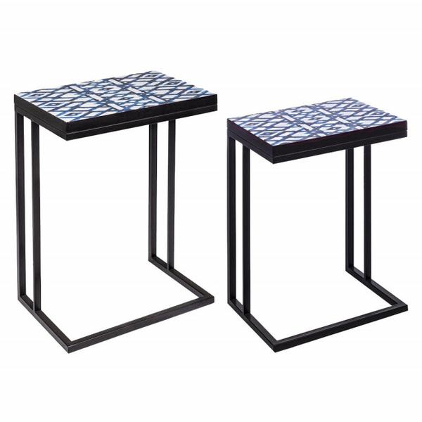 Descriere Set 2 mese laterale albastre/negre din MDF si otel Neapolis Bizzotto Dimensiuni: \- Lungime: 40,5/45,5 cm \- Latime: 30/33 cm \- Inaltime: 56/62,5 cm Material: MDF si otel Masutele Neapolis au blatul din MDF cu decoratiuni imprimate, iar cadrul este realizat din otel cu invelis de vopsea pulbere epoxidica.