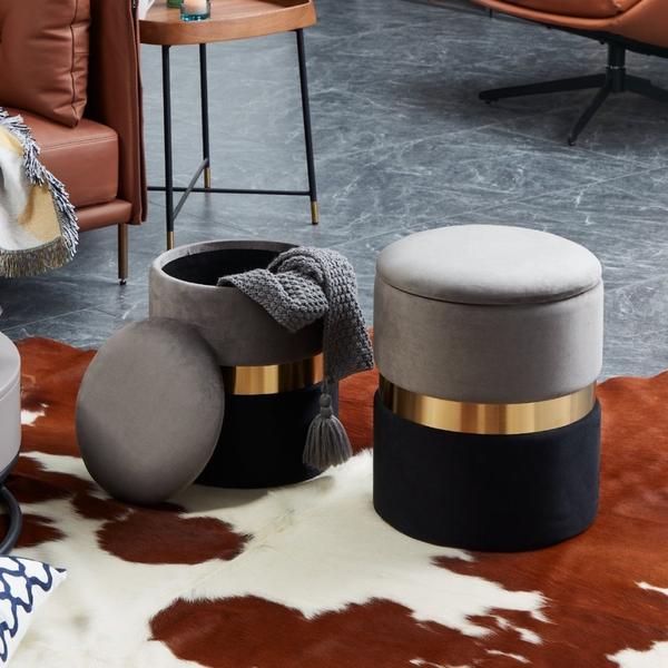 Set de taburete in stil modern cu aspect original. Au spatiu de depozitare. Acoperite cu tesatura gri si neagra cu detalii aurii. Dimensiunile taburetului mic: 38 x 31,5 cm. Dimensiunile taburet...
