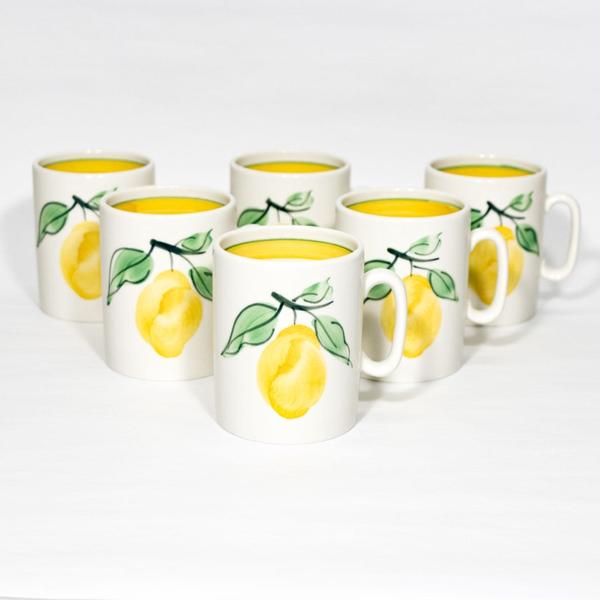 Set atemporal de 6 cani ceramice Hubert de culoare alba cu detalii galbene si verzi si cu motiv de para.