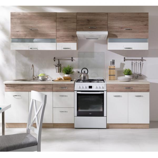 ⚠️ Chiuveta, electrocasnicele si elementele de decor NU SUNT INCLUSE (sunt doar pentru prezentare) Dimensiuni produs (gabarit): • Lungime: 270 cm • Adancime: 60 cm Materiale: • PAL Melaminat • MDF Lucios • Cant ABS • Manere metalice • Glisiere cu sina • Picioare PVC cu reglaj Dimensiuni corpuri: • Corp inferior chiuveta ECO-13D (L x h x A): 90 x 82 x 51 cm • Corp inferior cu sertare ECO-8D (L x h x A): 40 x 82 x 51 cm • Corp inferior cu rafturi ECO-6D (L x h x A): 80 x 82 x 51 cm • Corp superior cu sticla ECO-42G (L x h x A): 90 x 72 x 32 cm • Corp superior cu raft ECO-31G (L x h x A): 40 x 72 x 32 cm • Corp superior cu sticla ECO-41G (L x h x A): 80 x 72 x 32 cm • Corp superior pentru hota ECO-36G (L x h x A): 60 x 36 x 32 cm • Blat (L x h x A): 271 x 38 x 50 cm Culori produs: • Corpuri superioare: \- culoare corp: PAL Sonoma \- culoare front: PAL San Remo + MDF Alb Lucios(HG) • Corpuri inferioare: \- culoare corp: PAL Sonoma \- culoare front: PAL San Remo + MDF Alb Lucios(HG) \- blat: PAL travertin Avantajele produsului: • Accesorii incluse: polite, feronerie • Blat termorezistent 38 mm inclus Informatii suplimentare: • Numar colete: 26 • Greutate: ≈ 202 kg Garantie (luni): 24 Important: ⚠️ Chiuveta, electrocasnicele si elementele de decor NU SUNT INCLUSE (sunt doar pentru prezentare)! ⚠️ Produsul se livreaza demontat, insotit de schita de montaj si accesoriile necesare montajului. ⚠️ Imaginile produsului au caracter informativ si pot contine accesorii neincluse in pret, culorile se pot vedea diferit fata de cele reale in functie de display.