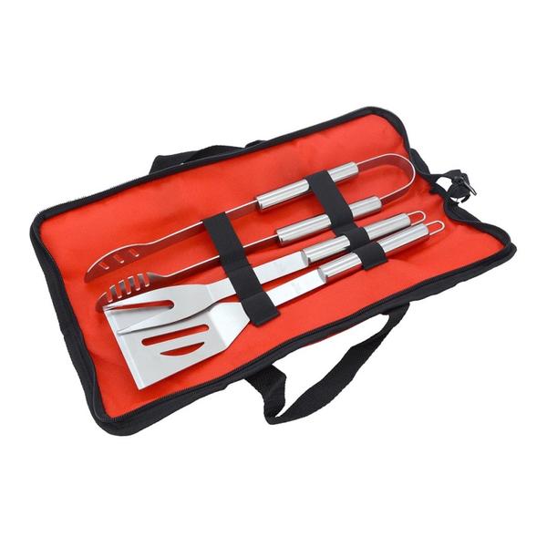 Acest set de ustensile pentru gratar este format dintr-o spatula, o furculita de gratar si un cleste. Cleste: 35 cm. Furculita: 32 cm. Spatula: 33 cm. Intregul set este asezat frumos intr-o trusa de transport de dimensiuni mici, cu inchidere cu fermoar. Setul poate fi folosit atat acasa, in gradina, cat si pe drum.