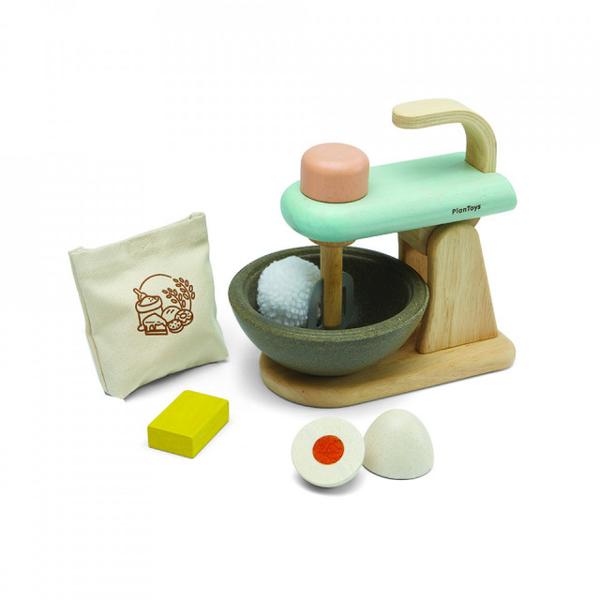 Descriere Set de joaca 4 piese multicolor din lemn Stand Mixer Plan Toys Dimensiuni set: \- Lungime: 15,7 cm \- Latime: 15,7 cm \- Inaltime: 19,4 cm Material: plastic si lemn Varsta recomandata: 2+ ani.
