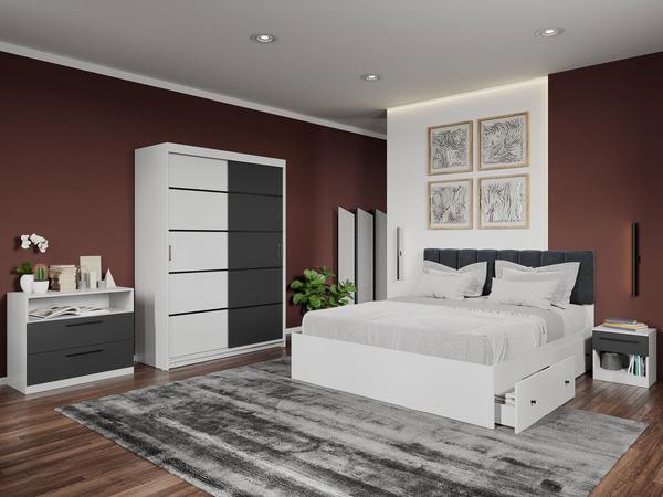 Informatii suplimentare Greutate 215,7 kg Latime 138 cm Inaltime 194,8 cm Aspect Perlat Caracteristici Cu bara haine , Cu polite , Cu sertare Culoare Alb cu Gri Antracit Material PAL , Tapiterie Usi Usi Glisante Saltea compatibila 140/160/180 x 200 cm Colete 11 Garantie 2 ani Termen de Retur 14 zile lucratoare Model Usa Baghete
