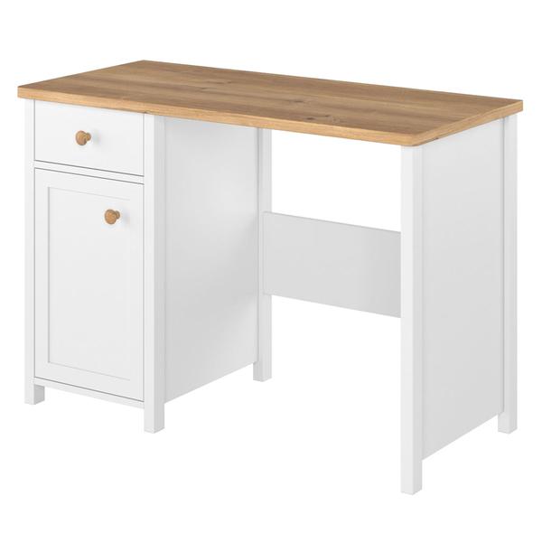 Birou copii, 1 usa, 1 nisa Sylvie. Piesele de mobilier ale gamei Sylvie completeaza camera celor mici pentru ca acestia sa creasca si sa se dezvolte in cele mai bune conditii. In perioada lor de formare este foarte important ca locul lor cel mai de pret sa fie amenajat cat mai elegant, rafinat si deosebit pentru a le dezvolta creativitatea si simtul stilului. Biroul din gama Sylvie este realizat din panouri aglomerate din lemn cu canturi ABS, bicolore. Blatul poate sustine o greutate de maximum 10kg. Acesta include o polita cu o usa pentru depozitarea obiectelor, ce sustine maximum 5kg, iar sertarul poate sustine maximum 3kg. Manerele sunt discrete si foarte versatile, sub forma unor butoni rotunzi de plastic. Dimensiuni: L. 110 x l. 52 x H. 76 cm. Material: panouri aglomerate din lemn melaminat, ABS. Culoare: alb, stejar. Citeste mai multe despre intretinere.